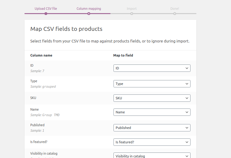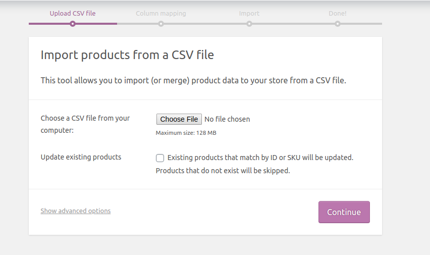 The import is in a few steps. The first is to upload the CSV. If you are importing products which you already have on the website but are updated in any way you can enable the option on the first screen which will update the existing products as well. However, if you leave the option disabled and upload a product which is existing on your website after the import both products will be visible on the website. Once you are done click on the “Continue”.