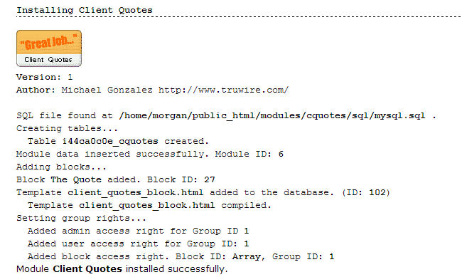 Under “Actions” click the install button to install the module. You should receive a message that the module has been successfully installed, similar to the one below: