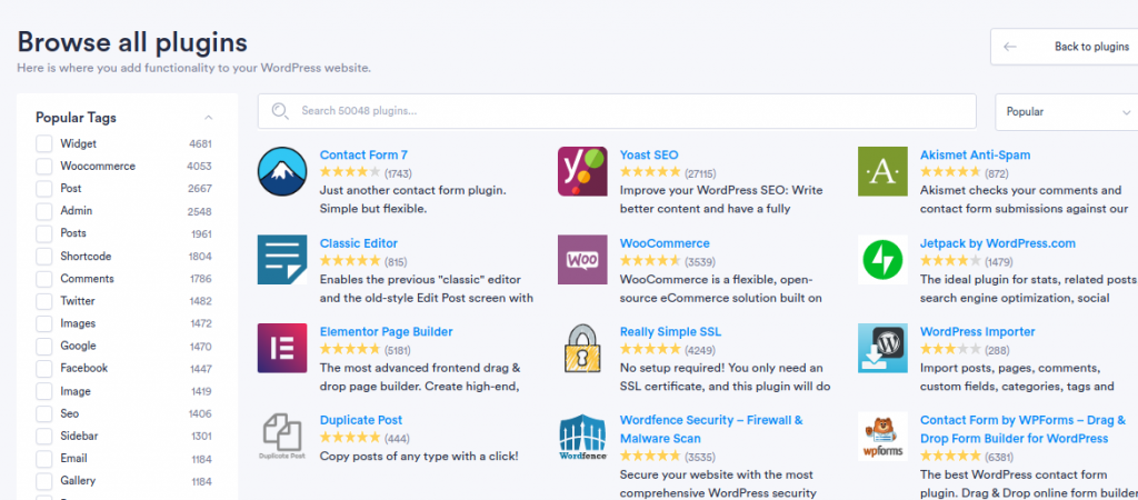 The “Browse plugins” tab will open a page with search bar and a column with popular tags with which you can easily sort the plugins and find the one which will suit you best: