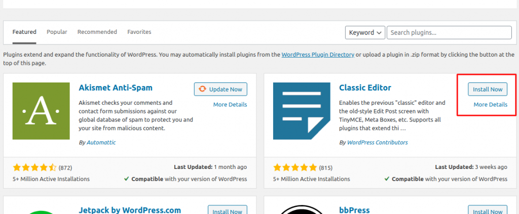 Once you access the admin area of your website on the left column you will see the “Plugins” section from which you can view the installed plugins and add new ones. The “Add new” tab provides you with the most popular plugins and a search tab in which you could browse the plugin you need. Every plugin has the “Install now” button at the right corner: