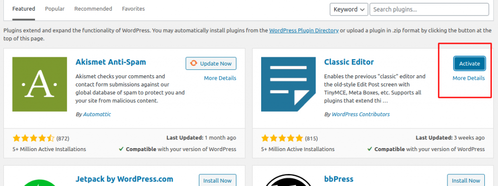 Click on the button “Install Now” and after that you should activate it by clicking on the “Activate” button which will make the plugin fully functional on your website: