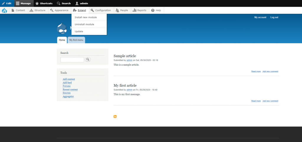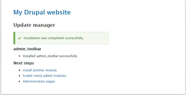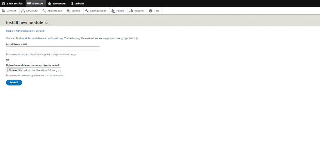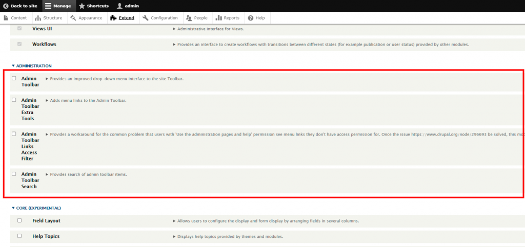 For this tutorial, we will install the “Admin Toolbar” module, which adds a drop-down menu when hovering over the main sections of your Drupal.
