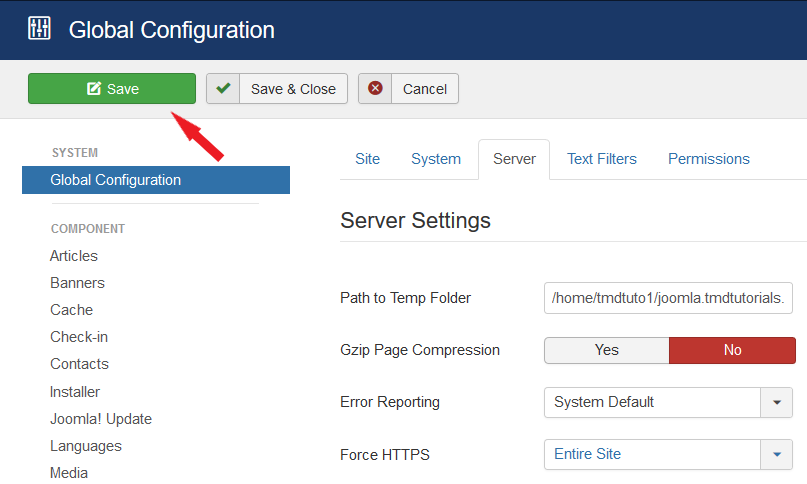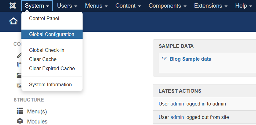 Once logged into your Joomla dashboard, select “System” from the menu on the top of your screen and click “Global Configuration” from the drop-down.
