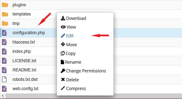 The final step of the process is to make one quick change in the “configuration.php” file of your Joomla website. You will find this file in the root folder for your website. Once located, right click on the “configuration.php” file and select the “Edit” option.