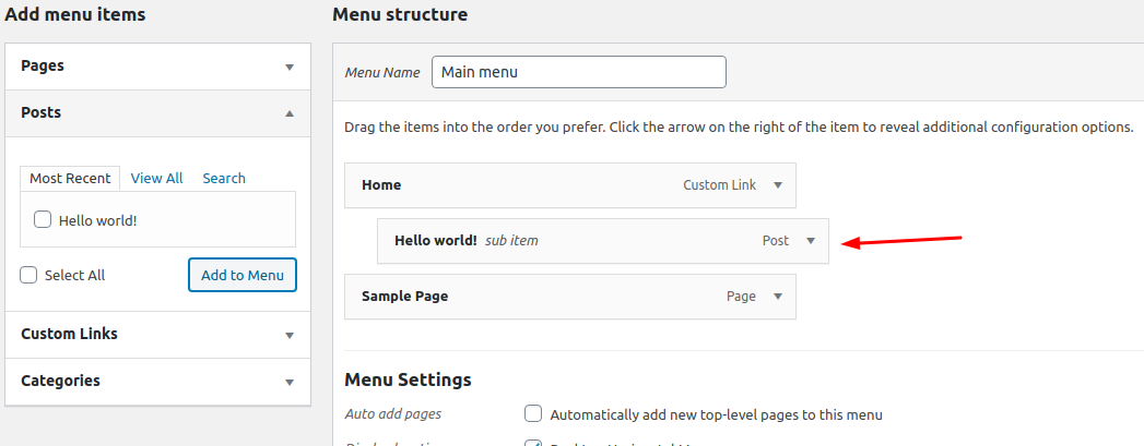 all you need to do is select the pages or posts you want in the menu and click “add to menu” After that you can drag and drop them right under the page on which they will be visible: