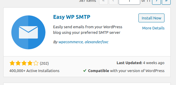 After that access the admin area of your website(https://yourdomain.com/wp-admin) and go to Plugins → Add New and install the Easy WP SMTP plugin