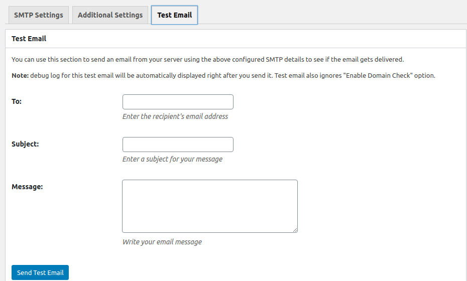After you fill the fields it is time to test if everything is properly working. To do so go to Test Email tab: