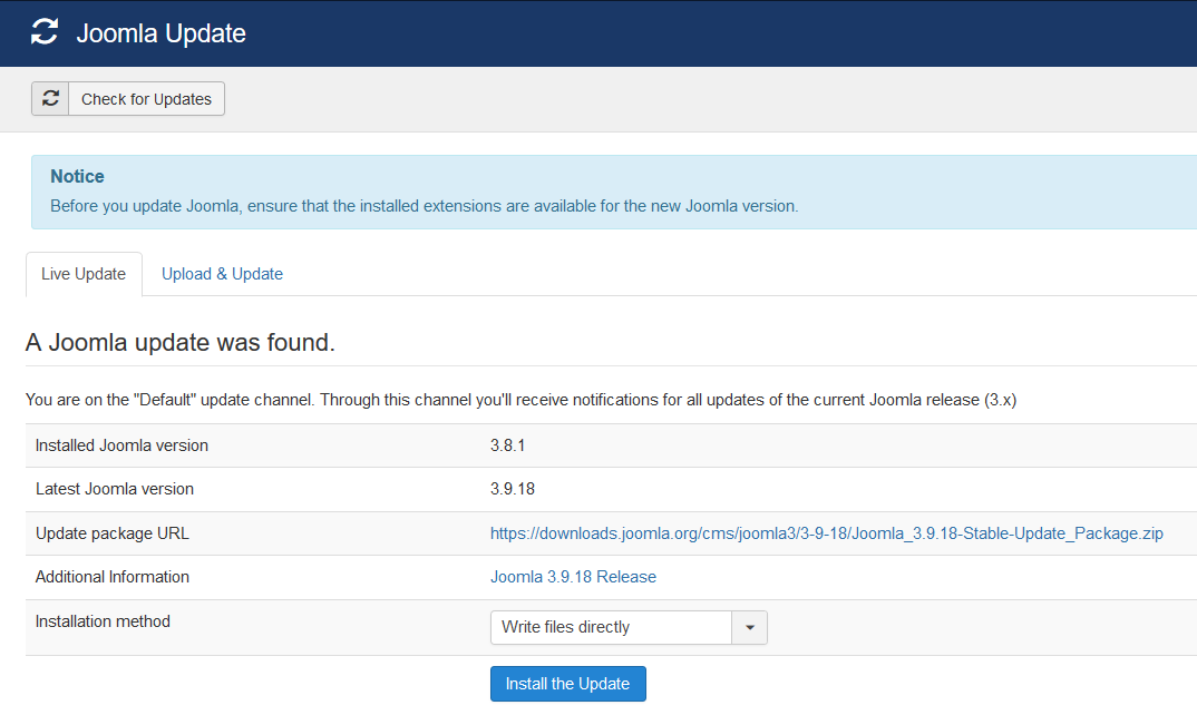 Once you click to update Joomla, you will be directed to the “Joomla Update” page, where some additional information regarding the update will be provided. Once you are ready to update your Joomla website, click the “Install the Update” button.