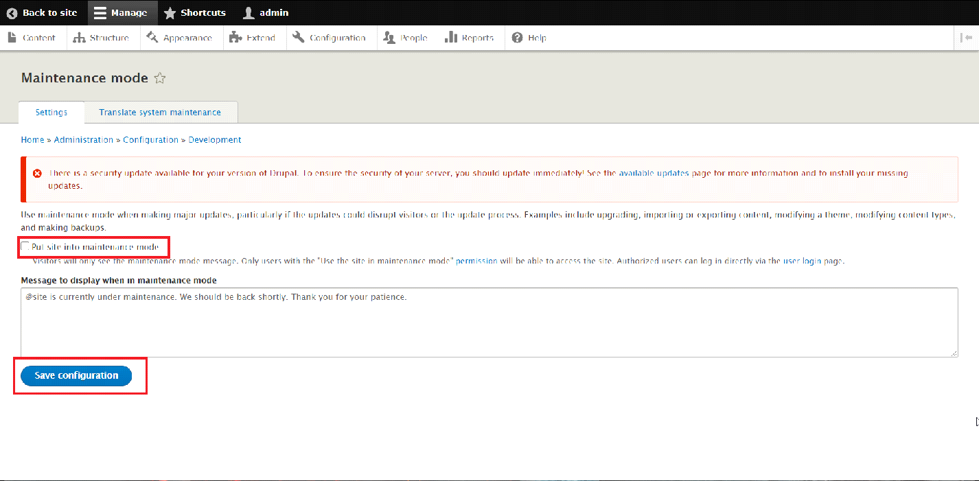 There, uncheck the option "Put site into maintenance mode" and then click on the "Save configuration" button in order to successfully disable the Maintenance mode of your Drupal website.