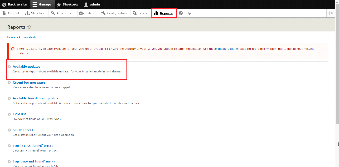 Now that we have installed the "Update Manager" module, we can proceed in checking the Modules for updates. In order to check for updates, navigate to the "Reports" section of the Administrative panel and then select "Available updates".