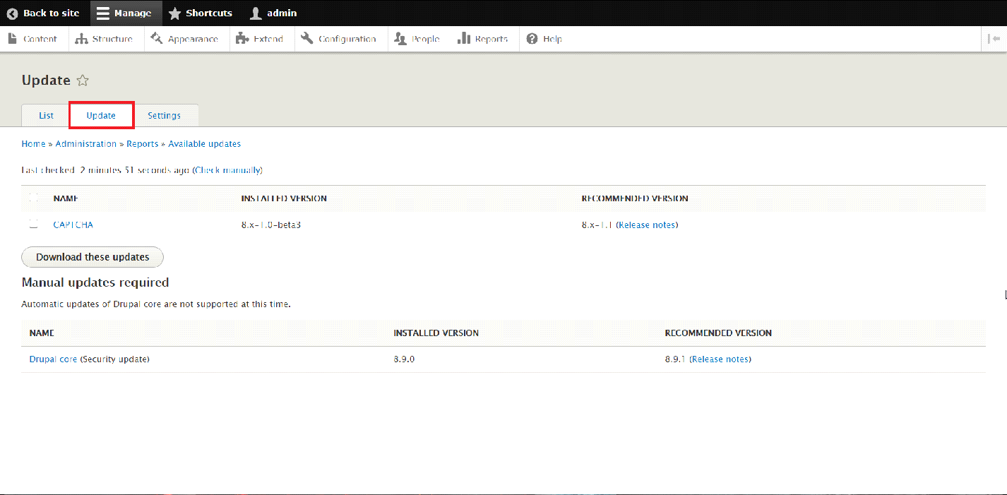 Now that we have checked for available updates, we may proceed in updating the Modules. We have to navigate to the "Update" tab at the top of the page.