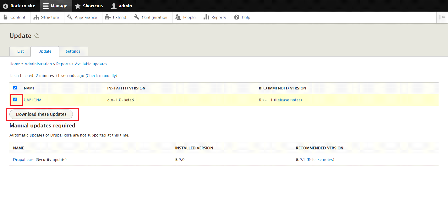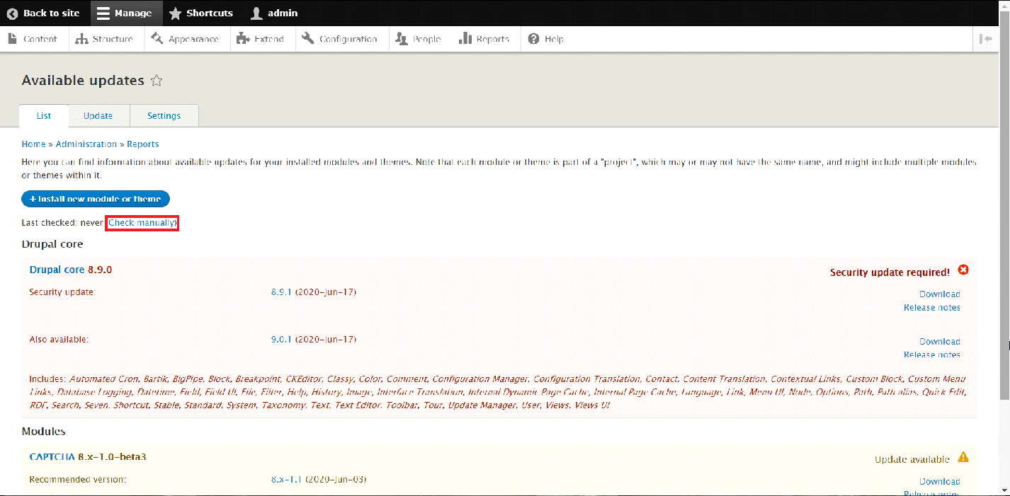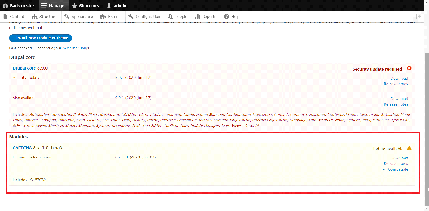 When clicked, the page will be refreshed with updated information regarding the available updates for the Modules of the Drupal website. As an example, there is an available update of the "CAPTCHA plugin stated on the bottom of the page.