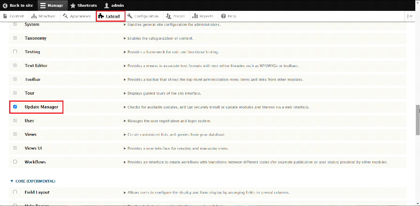 In order to be able to update Modules, we will need to first install the core module "Update Manager". This can be done by navigating to the "Extend" section of the Administrative Panel. Simply scroll down until you find the "Update Manager" module and select the box infront of it.