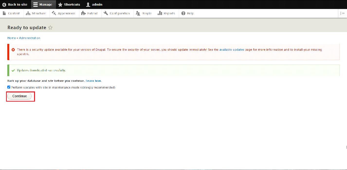 Once the updates are downloaded you will be redirected to a new page, where you have to confirm that you would like to update the modules by clicking on the "Continue" button.