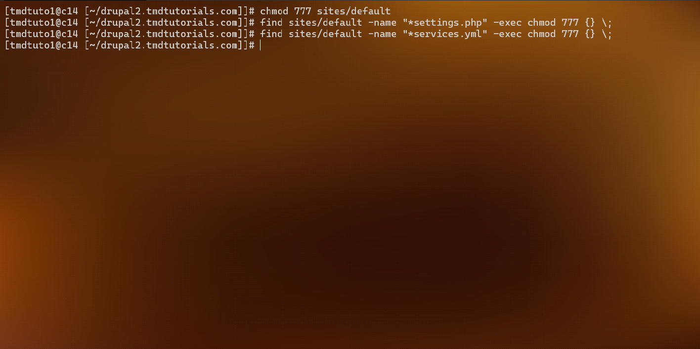 Once you have generated a backup of your Drupal-based website and are ready to update the application, you may proceed by setting full permissions to the configuration files of your website by executing the following three commands in the SSH window: