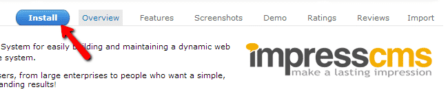 You will be taken to the ImpressCMS overview page in Softaculous. Click the “Install” tab: