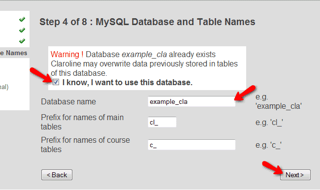 On the next step you should input your MariaDB database name and check the box that you are aware of the fact that this database exist and you would like to use it. You may proceed with the installation process and click on the Next button.