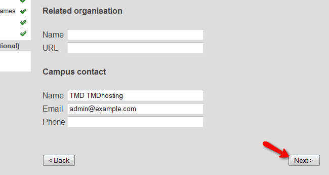 On the next page you can set related organization and campus contacts which are option steps and you can safely proceed by clicking on the next button.