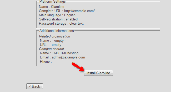 The last page of the installation provides you with a summary of all the applied settings. To complete the installation process, please click on the Install Claroline button on the bottom of the page.