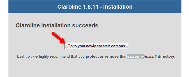 Be advised that you should remove the installation directory from your account for security reasons. You can perform this via your favorite FTP client. Simply access your account via FTP with your FTP client and navigate to the public_html/claroline/ directory where you should be able to locate the install/ directory. You can either rename or completely remove this folder.