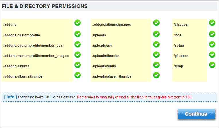 The next page will show all the important directories and the permissions for these. If there is incorrect permissions set for a folder you will see an error message. In order to fix that you may use your FTP client for which instructions for the setup were provided at the beginning of this tutorial. We are all good here as you may see on the following image: