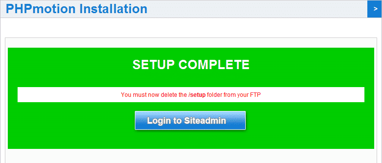 After you have removed the /setup folder you may access your phpMotion admin via the following URL: