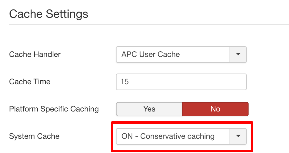 Scroll down to make sure that APC User Cache is selected and System Cache is set to “On – Conservative Caching”: