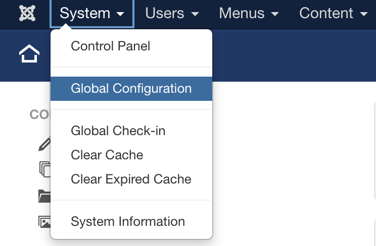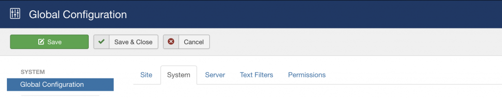 - Enable Caching in the website, so that static content can be accessed quicker after the first visit to it. To enable Caching in Joomla, access the Administrative area of the website and go to System -> Global Configuration: