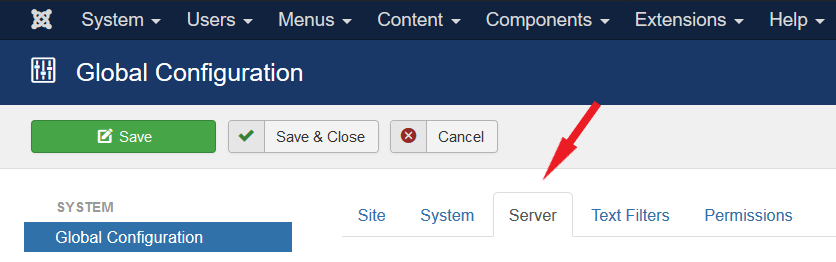 Once logged into your Joomla dashboard, select “System” from the menu on the top of your screen and click “Global Configuration” from the drop-down.