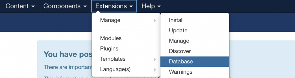 At the time of making this tutorial, the newest version was 3.9.19. After a successful update you may clear the website’s and your browser’s cache, then check if the database should be updated as well. This can be done by navigating to Extensions -> Extension Manager -> Database: