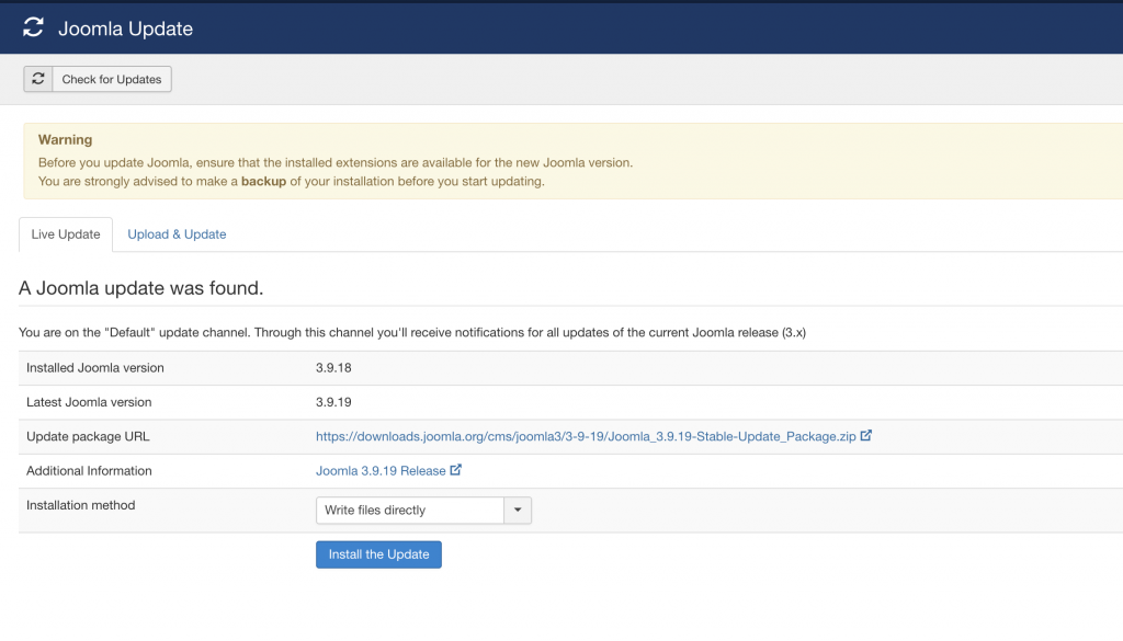 - Important: It is highly recommended to have the Joomla website files and database backed up before initating updates.