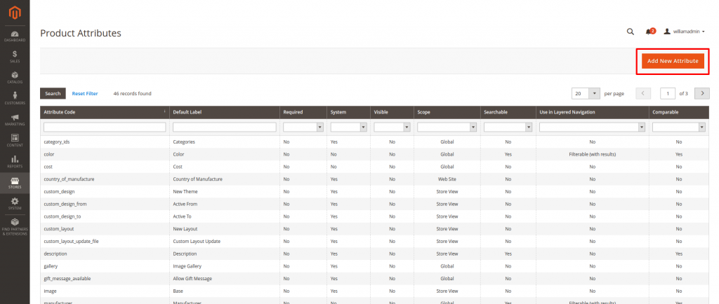 You will be directed to a new Page that will display all the created attributes that every Magento Store has by default. In order to create a new attribute you should click on the “Add New Attribute” button on the top right corner of that page. You can see the layout of the page and the button itself in the screenshot below: