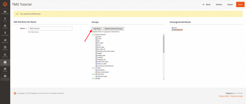 Once Done, click on the “Save” button once again on the top right corner and you should have your new Attribute Set ready for use.