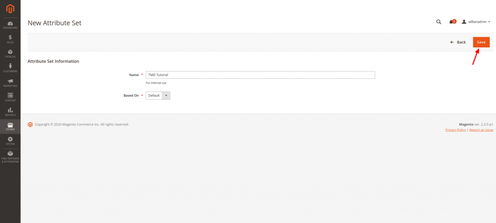 You will be taken to a new Page that only has the option to create the Attribute Set Name, but this is completely normal, as we will address the rest of the options later in this Tutorial. Once you have chosen the Attribute Set Name, simply click on the “Save” Button:
