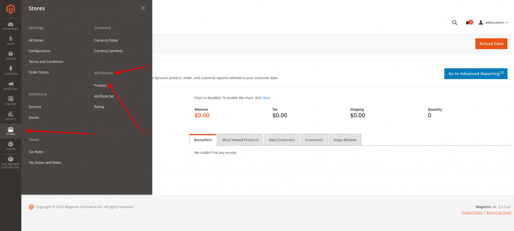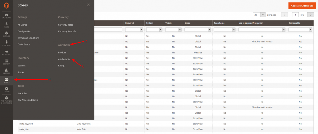 The first step would be to access your Magento Admin Area Dashboard and navigate to Stores (1) > Attributes (2) > Product (3) as described in the following screenshot: