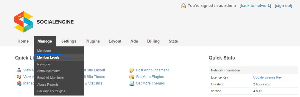The first step you need to perform is to access the dashboard of your social network and navigate to Manage > Member Levels: