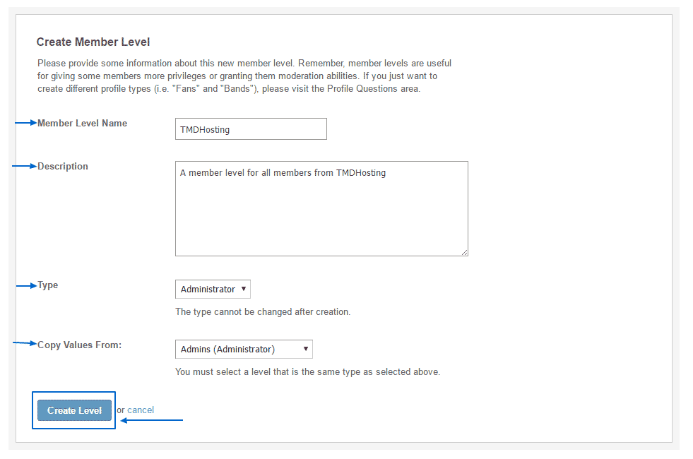 On the new page where you will be redirected to you have to enter the level name, description, type and copy the privileges from specific member level that already exists:
