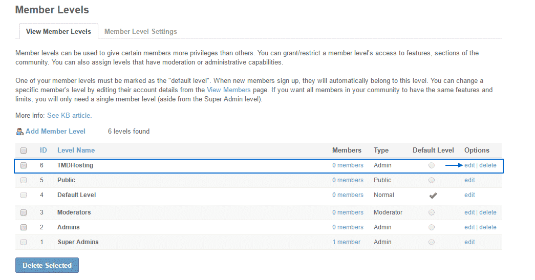 Public – this member level includes all the unregistered visitors of your website. They can browse your network without logging in. This level cannot be deleted.