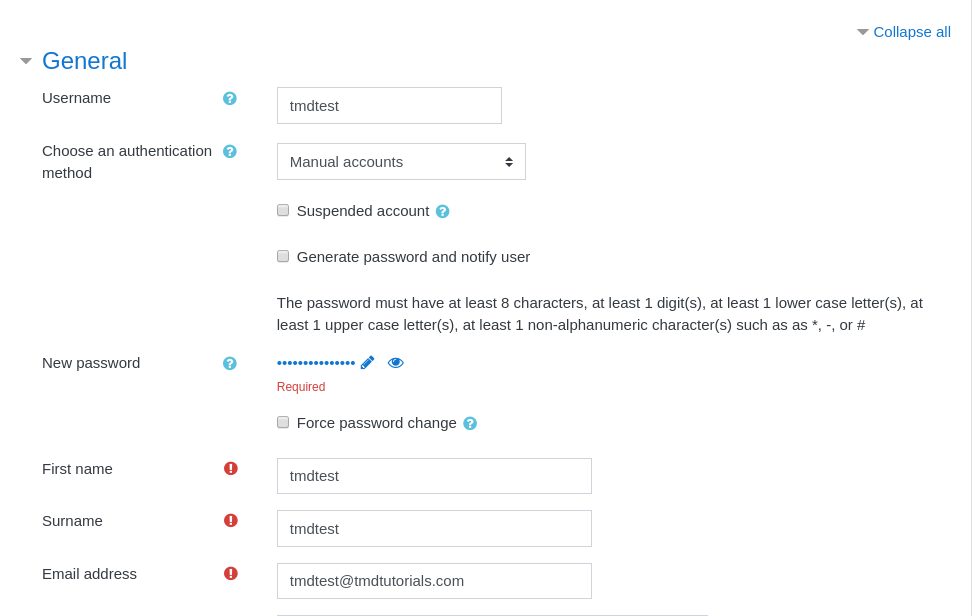 Once you have clicked on the option you will be redirected to a new page where you should input the information of the User which you wish to create. Please note that all of the details could be altered in the future if you decide to do it. The mandatory fields for the User creation are as follow: