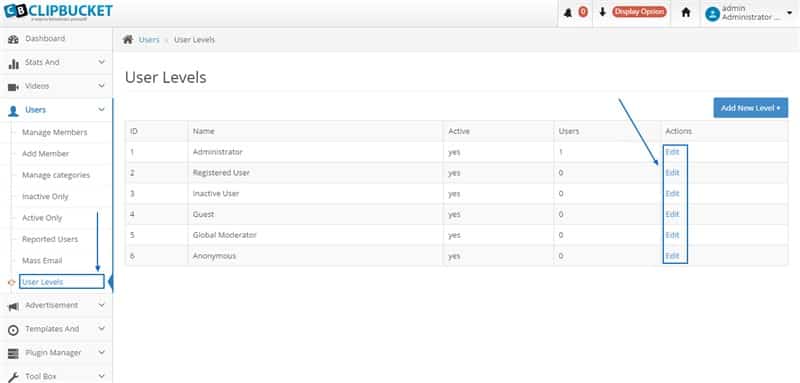 First, you can choose the last option of the drop-down menu – User Levels. When you click on it you will see the section, where the default six different user levels will be visible. You can always add new ones through the blue Add New Level button at the right. Each of them has certain permission to perform specific tasks, but you can also amend each of them by simply clicking the Edit button at their right:
