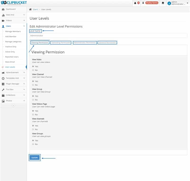 In the Edit Level Permissions area you will see the Level Name, which you are about to edit and in the four menus below it – you will be able to change its viewing/uploading/administration/general permissions, according to your needs, and then simply click on Update to implement them: