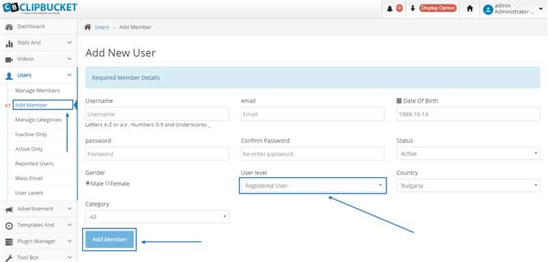 When you want to add a new member with specific functions, just go to Add Member. There, you can fill in all the information for the new profile in the blank fields (username/password/email,etc.) and then through the User level option you can choose the one, who you have set the specific permissions for. After you have finished with every section – simply click on the Add Member button below: