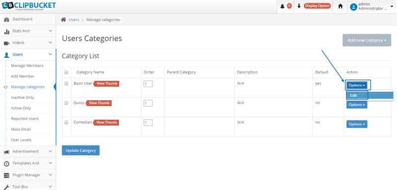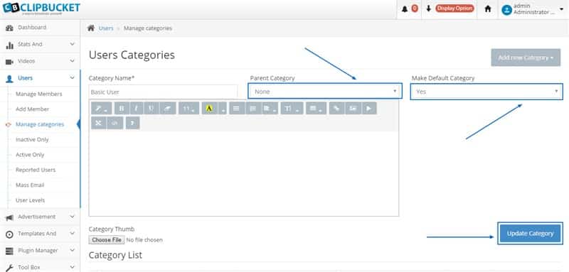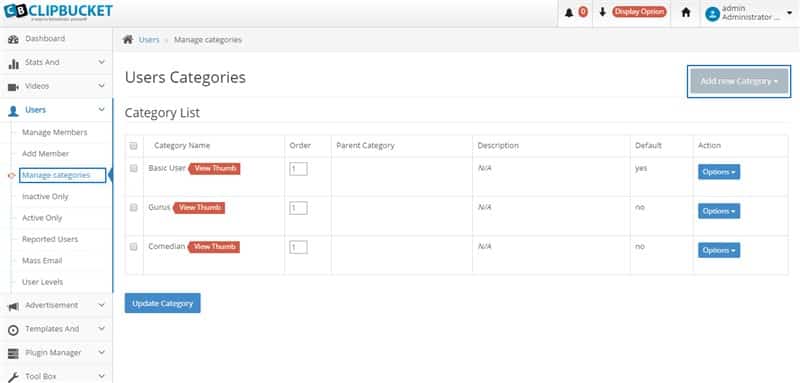 Finally, if you want to manage the users with certain privileges faster, you can simply group them together. To do that, go to the Manage Categories section, where you can add a new category: