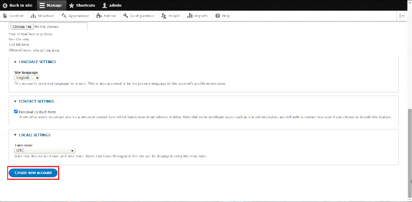Once you have entered the requied infromation for the new account, you may proceed in creating the new User by clicking on the "Create new account" button at the bottom of the page.