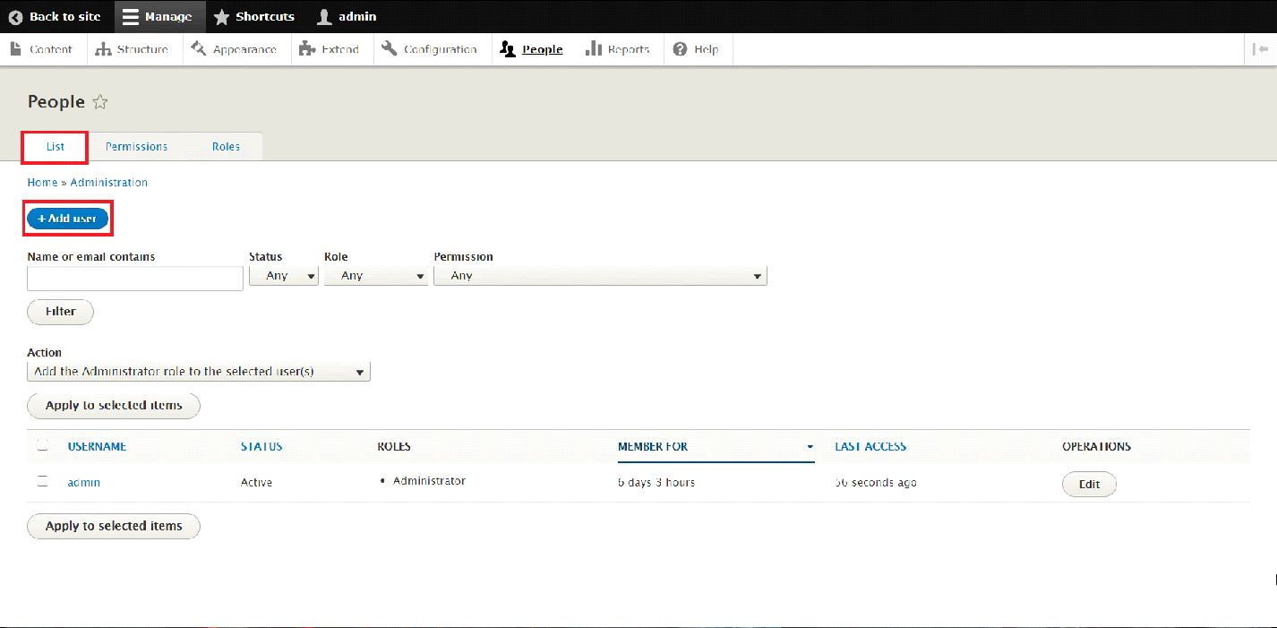 Since we have successfully created the new Role and assigned permissions to it, we may now proceed by creating the new User for the Drupal application. This can be achieved in the "List" tab.