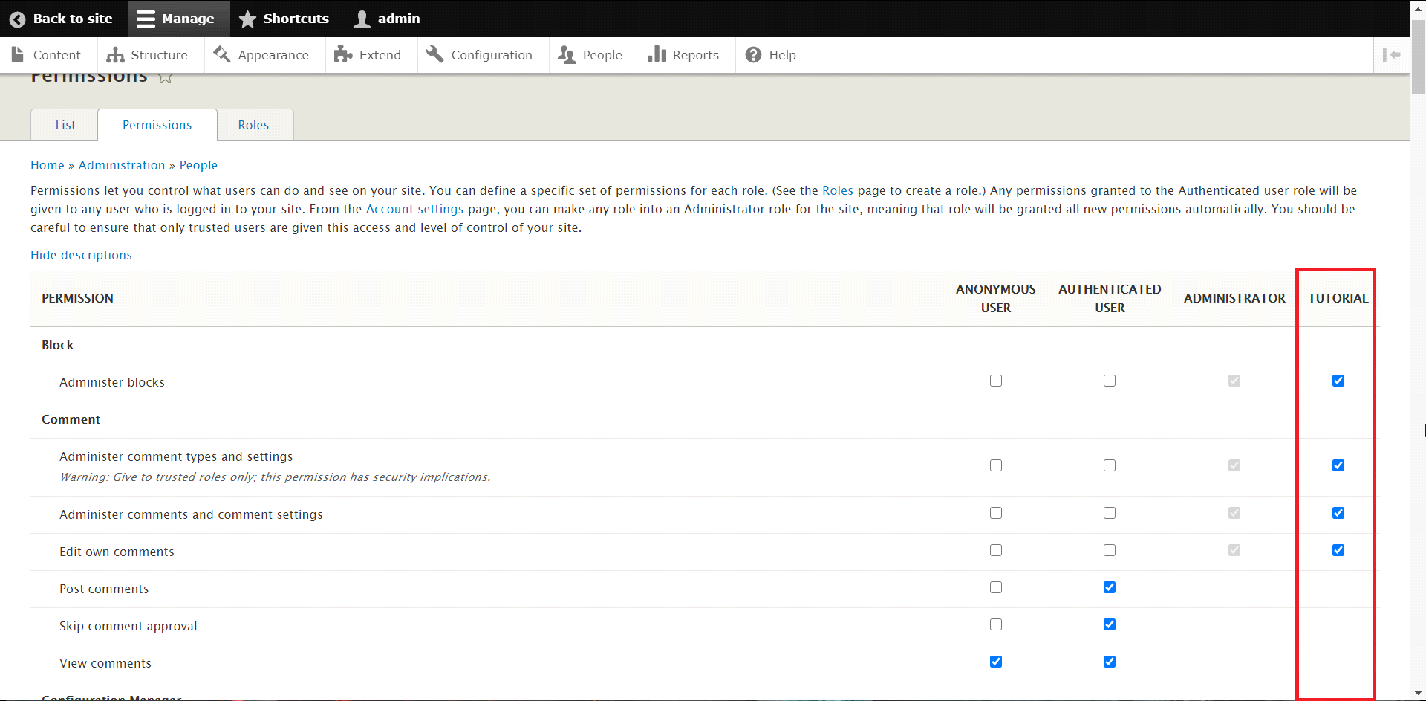 There you can choose which permissions to set for the new Role, by simply ticking the boxes under the name of the new Role.