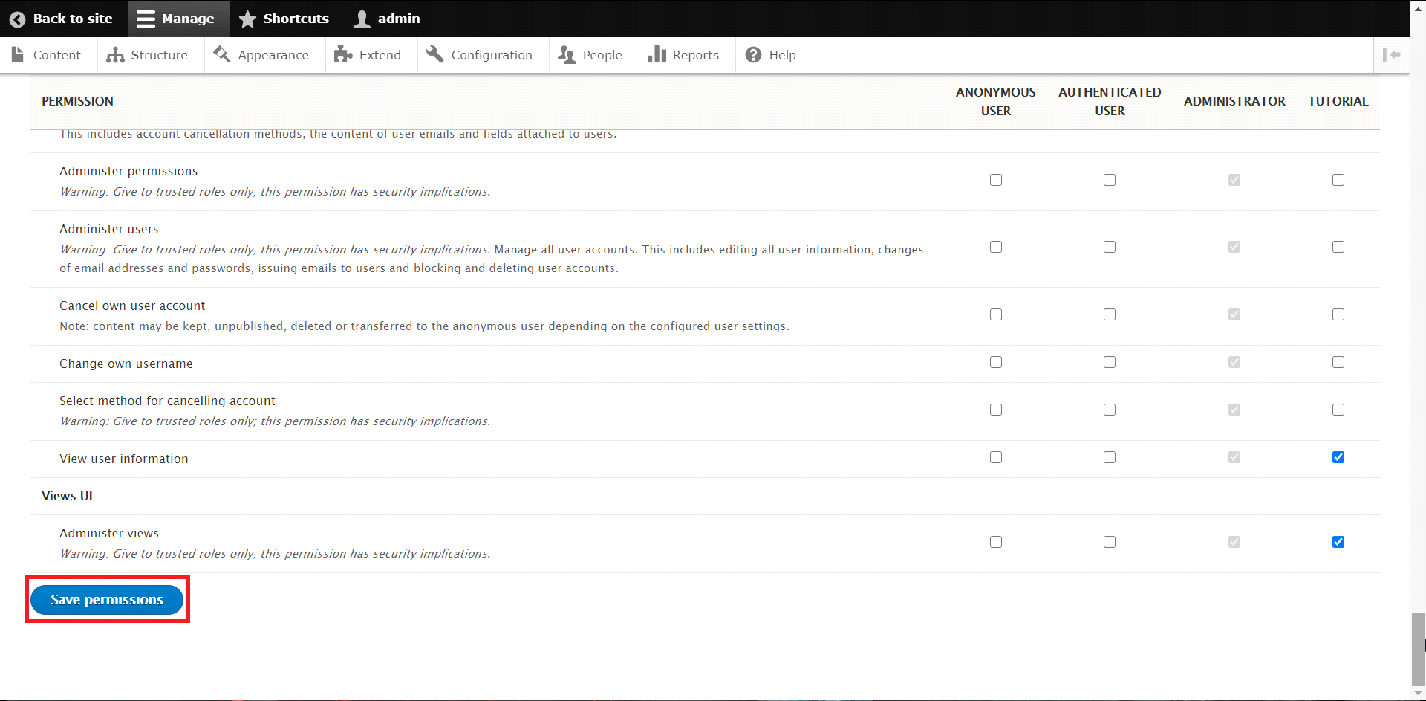 Once you have selected the desired permissions, you may proceed by saving the changes. Scroll down to the bottom of the page and choose the "Save permissions" button.