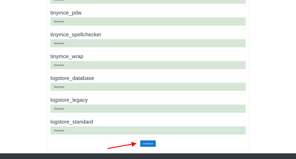 In the next step of the installation wizard you will be provided with information of the installation process of all Moodle related services and if the services are deployed properly you could proceed to the next screen by clicking on the continue button: