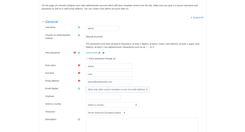- Username: The username which you will use to access the administrative page of your Moodle application