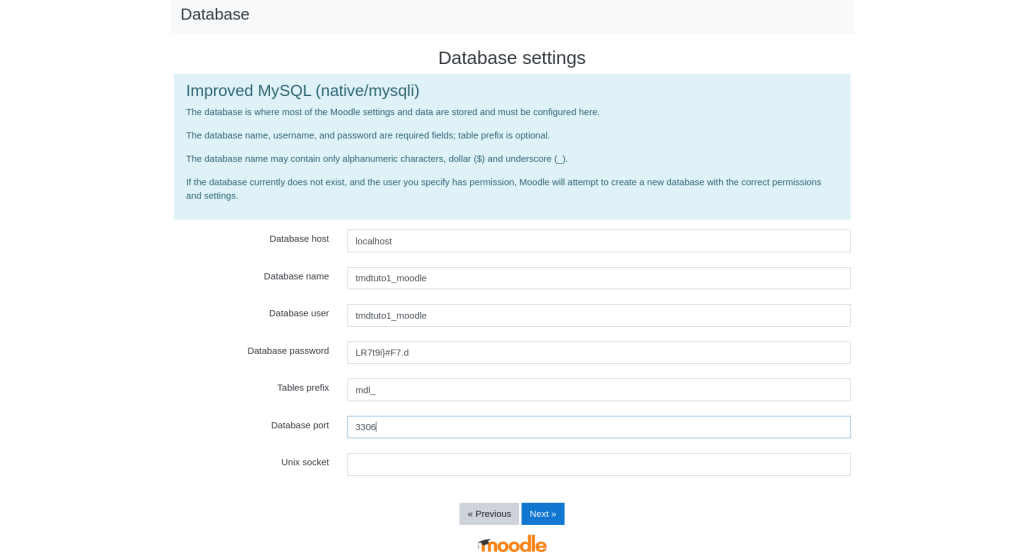 In the next screen of the installation process you will be asked to fill the database details for your Moodle application. You should set the details of the database which was created earlier using the Database Wizard.